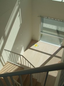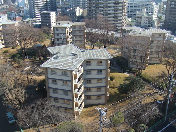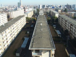 UR, the semi-private national public housing corporation, has been reconstructing some of the Akabanedai danchi for several years now and offering new rental apartments in a staggered series of offerings. On Jan. 22 they started the second wave of apartment inspections, which will last only until Jan. 30. Altogether, five apartment blocks, affixed with the romantic moniker Nouvelle Akabanedai, were rebuilt comprising 942 units, though only 191 are available to the general public, the remaining already being occupied by the tenants who lived in the danchi that formerly sat on that piece of land. We dropped by to see the merchandise and were struck first by the layout of the buildings, which were arranged in two courtyard formations: lines of apartments enclosing two central squares that were taken up by parking garages. For the apartments on the south sides, there was no problem, since they looked out on greater Tokyo–Mount Fuji to the right, Shinjuku and Ikebukuro straight ahead, and even Tokyo Sky Tree looming far in the distance to the left. But all the other blocks basically faced one another and the parking lots owing to that undeniable Japanese penchant for situating housing with a southern–or as close to southern as possible–orientation. It seemed particularly unfortunate for the apartments on the eastern border of the complex, which commanded a beautiful view of Tokyo and even Chiba in the distance; or the ones bordering the north, which looked out on Saitama. However, it was the entrances of these apartments that looked out on these views, not the living rooms, which faced the parking lots.