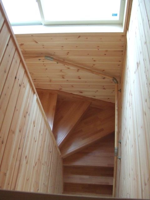 Upstairs the layout was even better: a master bedroom with a walk-in closet and two smaller bedrooms, one of which the husband used as his office (he’s an insurance salesman, but his hobby is shortwave radio–the parking space was occupied by a very tall radio tower) and the other for whenever they decided to have a baby, though at the moment it was used for drying clothes. The windows were large, and the wood was, again, everywhere. The couple had decided to do without doors on the closet, either sliding or accordion, and installed roll blinds, which apparently saved them a lot of money and was much more attractive.