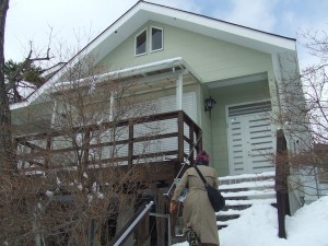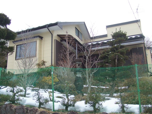 We then drove up to the next property, which was in a besso area in the mountains east of the city. Though it wasn’t far as the crow flies, it was located along a steep road. Snow was still abundantly on the ground up there, and the agent had trouble finding the entrance to the development, whose houses were scattered along private roads, meaning they hadn’t been plowed. The Aqua he had rented performed admirably albeit slowly as we climbed the hill past vaction houses closed up for the winter. We felt bad about asking him to take us here. If we’d known it was so remote and that snow was still thick on the ground we wouldn’t have. He had to park in the middle of the street, which was no problem since there was no one else using it. Then we had to plod to the house, which was perched on a rise. It was a typical vacation home: compact, simple. It wasn’t quite as bright as we had expected, and though the walls and floors were wood, the bedroom was tatami, and the winter dampness seemed to have made the mats slightly moldy. It also had a curious attic-loft with the most dangerous ladder contraption we’d ever seen. The agent said the owners were an older couple who lived in Tokyo and found it troublesome to come up here any more. It was trouble for us just to try to get into the loft, so I imagine they never even used it, unless they had grandchildren. In any case, it was quite impractical, even as a second house.