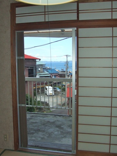 We then drove up to the first besso area, called Green Hill, which is an understatement. The ads on the various portal sites say the house is two kilometers from Ajiro station on the Ito Line, but we assume that’s two kilometers if you’re a crow. We drove for about fifteen minutes up grades that tested 15-20 percent in some stretches, and then once we reached the residential area had to meander through narrow roads laid out like randomly strewn spaghetti. The agent provided a constant flow of information that was more entertaining than the usual sales pitch. He told us about the celebrities who lived in the area (“the late songwriter Aku Yu had a large second home over there, but since he died his family has had trouble unloading it, even for ¥40 million”) and confided that his company didn’t deal much with weekend people. We finally arrived at the property, a two-story house with 78 square meters of floor space on a 247-square meter piece of land. It was in the middle of what could have been any other housing development in Japan except for one startling feature: the view. You could see the Pacific prominently in the distance. There was nothing blocking the view, mainly because many of the lots on the block were empty. Given that the house was originally built in 1969 this seemed strange, but more on that later. The house had been bought from the family of the previous owner, a man who had recently died but whose main home was in an expensive neighborhood in Shibuya, by another real estate company that was half-heartedly fixing it up. We didn’t have to take our shoes off because the floors were covered with vinyl protectors. The first floor consisted of a large LDK area with sliding glass doors to the south and the east. There was also a bathroom and a six-mat washitsu with moldy tatami. An incongruous bannister-less stairway led up to the second floor, which consisted of a small room with beautiful old-fashioned wooden sashes and a roka (hallway) that extended along the south side from which you could enjoy a panorama of the ocean in the distance. Behind it was another washitsu, this one with eight mats.