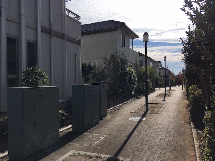 Except it really isn’t true. The vast majority of neighborhoods in this city of 100,000 people still have overhead utility lines. The areas where the lines are buried are mostly in those new housing developments, most of which haven’t been around for more than four or five years. The whole area north of the Hokuso Line seems to be where the majority of buried power lines are, but it isn’t the whole area, which was once owned by UR, the semi-public housing corporation. They bought in at a premium in the 1970s and 80s, and then finally sold it at a loss to developers about 10 years ago under pressure from the central government, who was tired of servicing the debt. The entire area is now a patchwork of different housing developments, each of which is a self-contained community cultivated by an individual developer containing between 100 and 170 or so homes, and while some neighborhoods are limited to a single manufactured housing company—Toyota and Panasonic are two that completely dominate some developments—some offer a small but limited selection of home builders, while others simply sell plots of land so the buyer can select their own builder. As far as infrastructure goes, each development is self-contained, so some have utility poles and others do not, which means you go from one street with overhanging wires to an adjacent street where the view of the sky is undiminished by poles and cables. It’s an odd feeling.